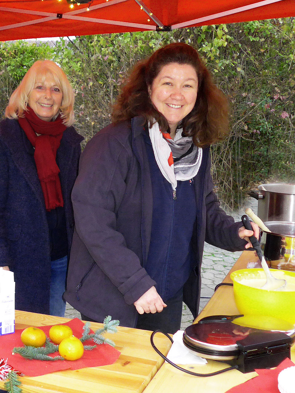 Schon auf dem Hof war klar, heute ist hier alles anders: Nicht nur ein geschmückter Tannenbaum, sondern insbesondere auch ein sehr großer, aufgeblasener Nikolaus begrüßte die Gäste und sorgte vor allem bei den Kleinen für leuchtende Augen. Das Begegnungscafé war liebevoll geschmückt: Tannenbaum, Adventskranz und die von der Krabbelgruppe und den Besuchern des DRK-Begegnungs- und Servicecenters Ahr gebastelten Sterne sorgten für Adventsstimmung. Im Hintergrund lief Weihnachtsmusik, der Duft von frischen Waffeln lag in der Luft. Glühwein, alkoholfreier Punsch und Kakao sorgten für das leibliche Wohl.