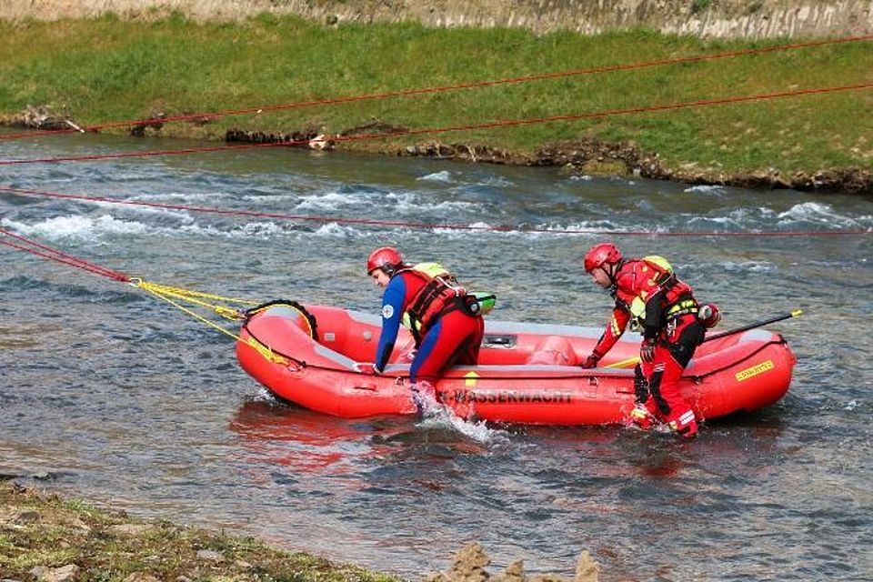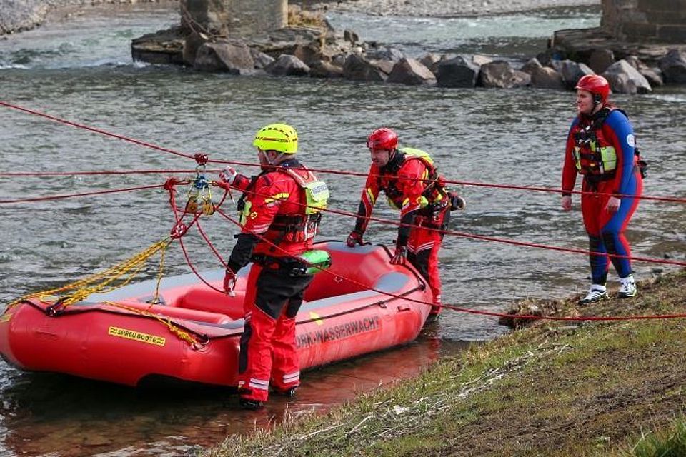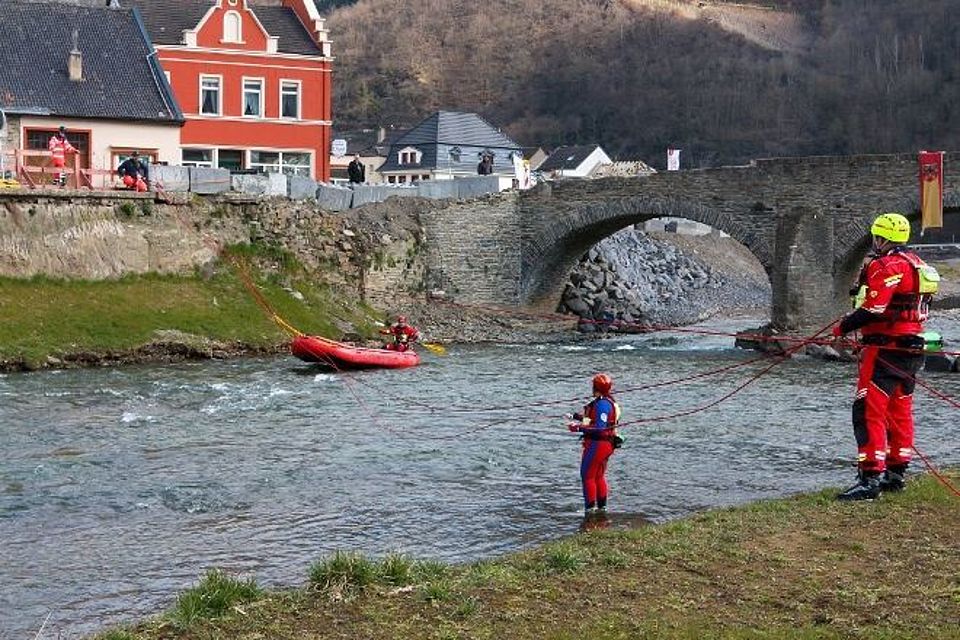 In Fließrichtung der Ahr übten zeitgleich fünf Fachkräfte der Fließwasserrettung und sicherten dabei den jeweils im Wasser befindlichen Taucher zusätzlich ab. Nachdem ein Seil von einem Baum quer über die Ahr bis zur Bundesstraße gespannt war, wurde das mitgeführte Raft, ein spezielles Wasserrettungsmittel, das Laien vom Aussehen her an ein Schlauchboot erinnert, zu Wasser gelassen. Unter Verwendung spezieller Rollen wurde es gegen unbeabsichtigtes abtreiben gesichert. Vorteil der Seilkonstruktion ist, dass dem damit gesicherten Raft je nach Bedarf Leine gegeben wird. Dadurch ist ein Versetzen längs in und auch seitlich zu der Strömung möglich. Zum Ende eines Einsatzes wird das Raft damit wieder problemlos an Land gezogen.