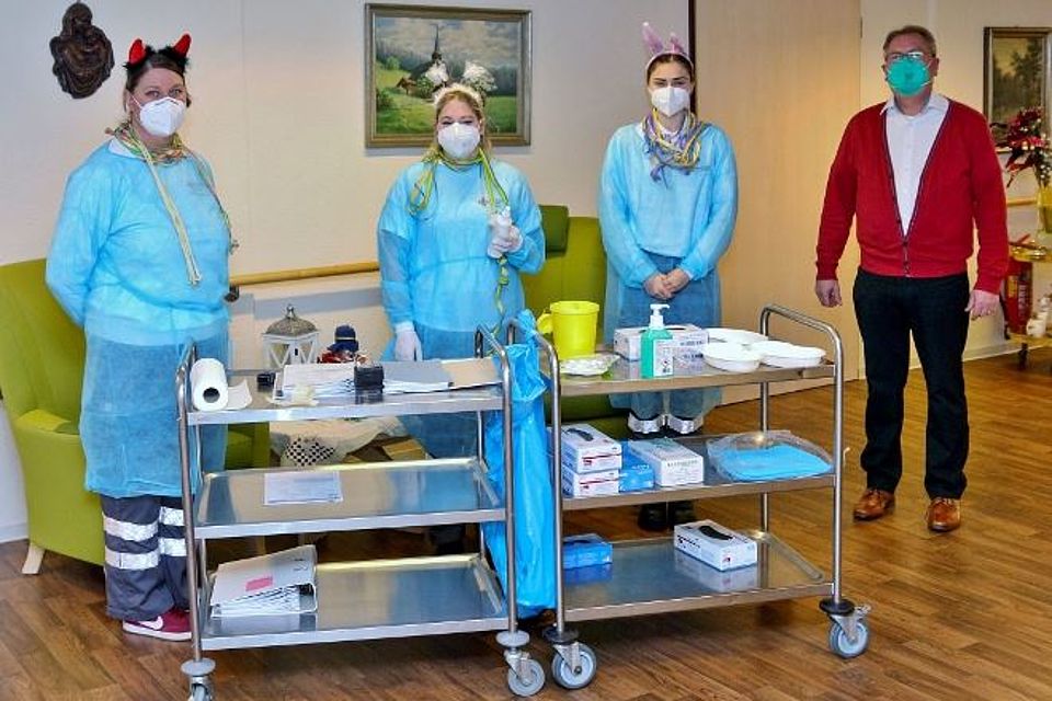 Kreis Ahrweiler. Jahrzehntelang klang am Weiberdonnerstag Karnevalsmusik durch die Gänge des Seniorenheims St. Maria-Josef in Ahrweiler. Dieses Jahr herrscht Stille. Dennoch huschen ein Häschen, ein Engelchen und ein Teufelchen, eingehüllt in blauen Einmalkitteln, mit FFP-2-Mundschutz, Einmalhandschuhen und Schutzbrille, über die Flure von Zimmer zu Zimmer. Es sind die ehrenamtlichen Kräfte eines mobilen Impfteams vom Deutschen Roten Kreuz (DRK) im Ahrkreis. Auch an Schwerdonnerstag sind die freiwilligen Helfer im Einsatz, um in der seit nun etwa einem Jahr währenden Corona-Pandemie zu helfen.