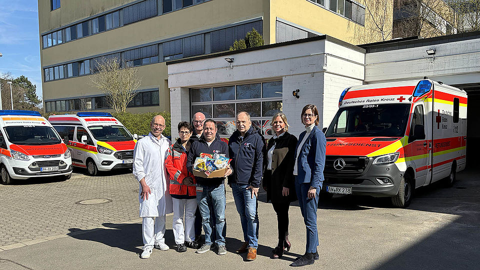 DRK_15.03.2024: (v.l.): Dr. Thomas Lepping, Ärztlicher Direktor Marienhaus Klinikum, Dr. Heike Kornemann, Ärztliche Leiterin Zentrale Notaufnahme und Notarztstandort, Boris Linden, stellvertretender DRK-Rettungsdienstleiter, Stefan Bertram, DRK-Rettungswachenleiter, Ulrich Bergmann, DRK-Kreisgeschäftsführer, Cornelia Bachem, Kaufmännische Direktorin Marienhaus Klinikum und Maria Heine, Krankenhausoberin Marienhaus Klinikum sind dankbar, dass die Rettungswache wieder neben der Klinik angesiedelt ist. (Foto: Astrid Zens / DRK-Kreisverband Ahrweiler e.V.)