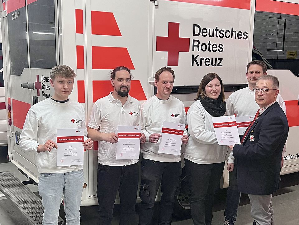 Es gibt Termine, die macht Michael Assenmacher, Vorsitzender des DRK-OV Bad Neuenahr-Ahrweiler, besonders gerne und dazu zählt die Ehrung verdienter und langjähriger Mitglieder. Bei der Jahreshauptversammlung dankte er Kerstin Pfeffer für 30 Jahre, Dirk Pfeffer für 20 Jahre, Marvin Bauerfeind für zehn Jahre sowie Thomas Klaes und Gerrit Finke für je fünf Jahre Engagement und überreichte ihnen eine Urkunde.
