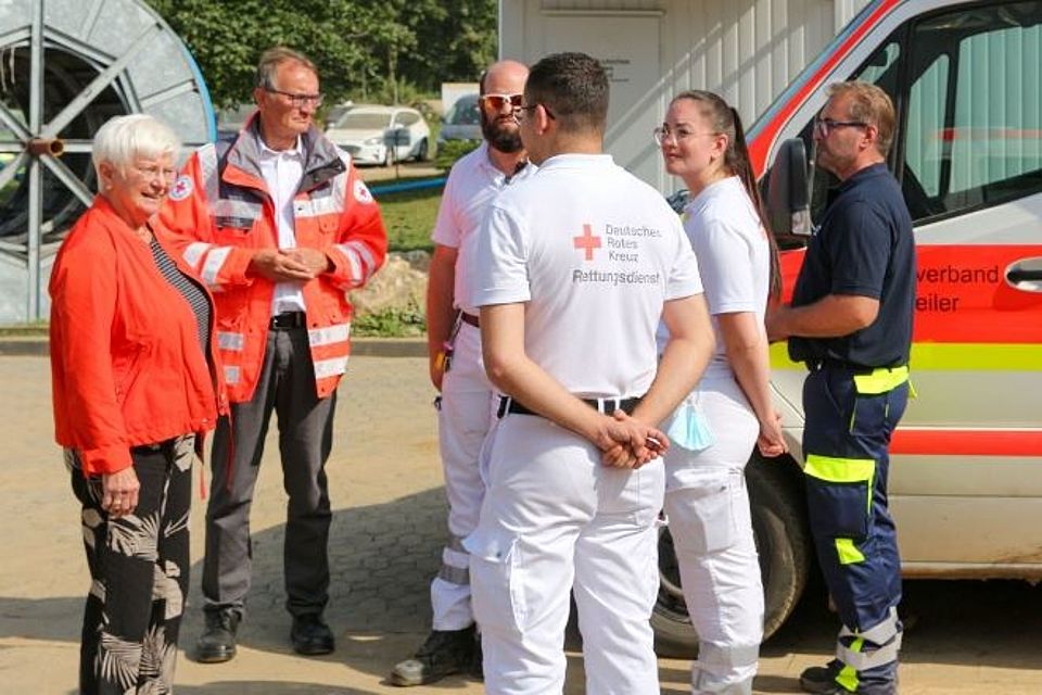 Der Keller der zentralen DRK-Kreisgeschäftsstelle in Ahrweiler stand am Rande des Katastrophengebietes deckenhoch in der braunen Brühe der Ahr. In der DRK-Rettungswache Bad Neuenahr-Ahrweiler war in der Katastrophennacht die Ahr mit bis zu 40 cm Höhe ungebetener Gast. Die Beschädigung der Diensträume der ältesten und beengtesten DRK-Rettungswache im Kreis Ahrweiler ist für die Mitarbeiter verschmerzbar. Schon seit Jahren kämpfen die Rotkreuzler für neue Diensträume in Bad Neuenahr-Ahrweiler. „Wenn nicht jetzt, wann dann?“, machten die Rettungskräfte DRK-Landesvorstand Manuel Gonzalez, DRK-Landespräsident Rainer Kaul und DRK-Präsidentin Gerda Hasselfeldt einem bekannten Lied folgend bei einem Besuch vor Ort klar.