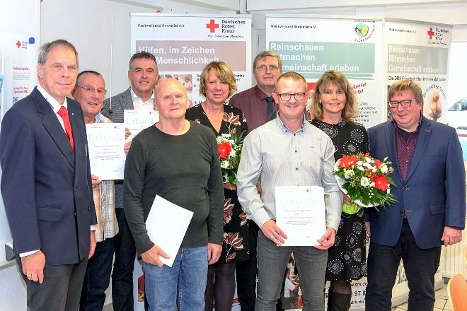 Kreis Ahrweiler. Auf insgesamt 205 hauptberufliche Dienstjahre zum Wohle ihrer Mitbürger bringen es sieben zu ehrende Mitarbeiter vom Deutschen Roten Kreuz (DRK) Kreisverband Ahrweiler e.V.. DRK-Kreisverbandspräsident Achim Haag und DRK-Kreisgeschäftsführer Frank Trömel luden die Mitarbeiter mit ihren Familienangehörigen Ende Oktober zur Ehrung mit anschließender gemeinsamer Feierstunde in die Kreisgeschäftsstelle des DRK in Ahrweiler ein.