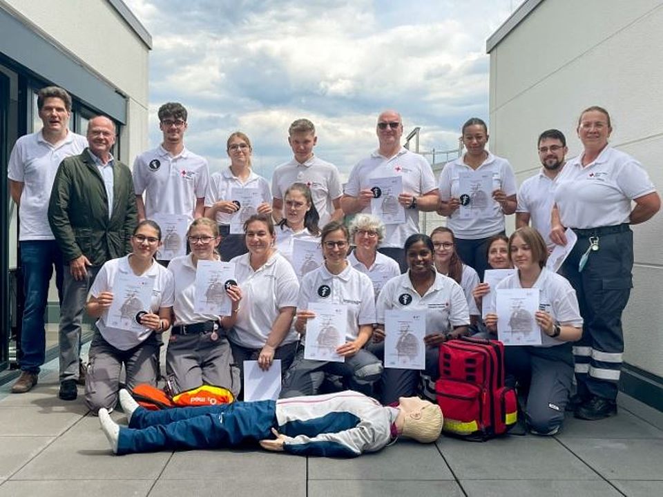 Unter Aufsicht von DRK-Sanitätsdienstausbilder Michael Alberti sowie DRK-Kreisverbandsarzt Dr. Frank-Peter Kaesler legten insgesamt 19 Einsatzkräfte aus den DRK-Ortsvereinen Adenau, Bad Breisig, Bad Neuenahr-Ahrweiler, Grafschaft, Remagen, Sinzig und Weibern kürzlich in Bad Neuenahr-Ahrweiler erfolgreich die Prüfung zu Helfern im Sanitätsdienst des DRK ab. Zuvor wurden an insgesamt drei Ausbildungswochenenden vom Ausbildungsteam, das durch Andreas Müller, Philipp Münch und Peter Hasenberg vervollständigt wurde, Themen wie Aufbau und Funktion des menschlichen Körpers, akute Erkrankungen von Bewusstsein, Atmungs- oder Kreislauftätigkeit, Knochenbrüche und Gelenkverletzungen, Vergiftungen, Hygienestandards, Rettung- und Transport, Einsatzgrundlagen, Rechtsfragen sowie zahlreiche weitere Inhalte theoretisch gelehrt und an Fallbeispielen praktisch geübt. Mit dem erlangten Wissen sind die ehrenamtlichen Helfer gut vorbereitet, um im Sanitätsdienst bei Veranstaltungen und im Katastrophenschutz ihren gemeinnützigen Dienst zum Wohle ihrer Mitbürger zu leisten.