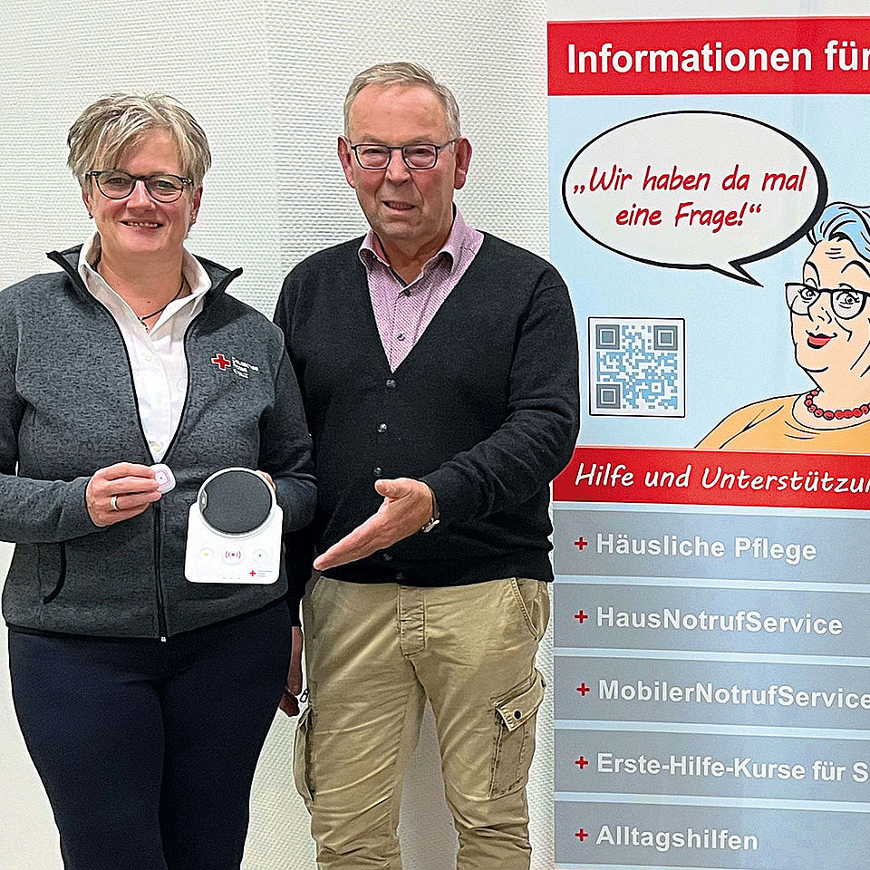 Anhand des Geräts und des Notfallknopfs erklärte Marion Simonis in ihrem kurzweiligen Vortrag die unkomplizierte Handhabung des DRK-HausNotrufs und schilderte mit viel Herz ausführlich die Abläufe nach Absetzen des Notrufs: Sobald dieser bei der HausNotrufzentrale eintrifft, disponiert und koordiniert das geschulte Personal den Einsatz entsprechend des Hilfebedarfs. „Der Rettungsdienst ist jederzeit in der Lage, auf die Schlüssel der Teilenehmenden zuzugreifen, um bei einem medizinischen Notfall schnell helfen zu können und genau das macht unseren DRK-HausNotruf so einzigartig.“, sagte Marion Simonis. Sie informierte über Kosten und Zuschüsse und ließ im Anschluss keine Frage unbeantwortet.