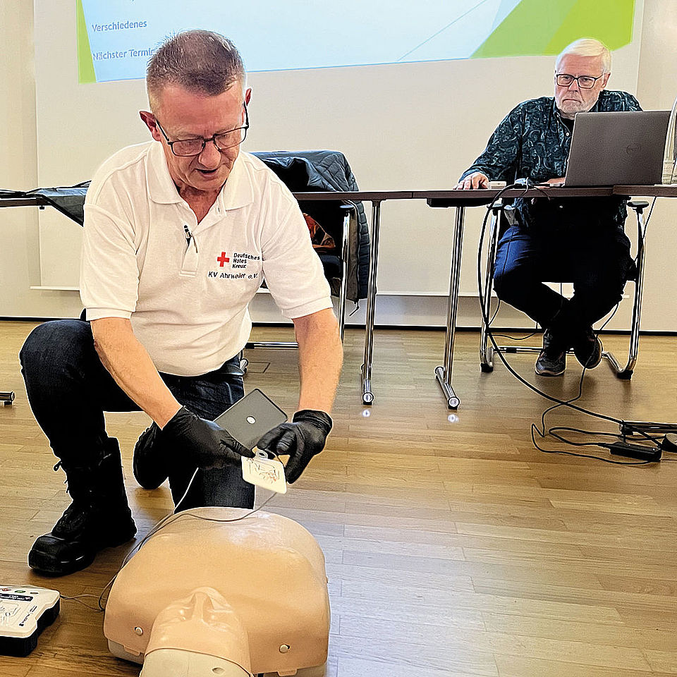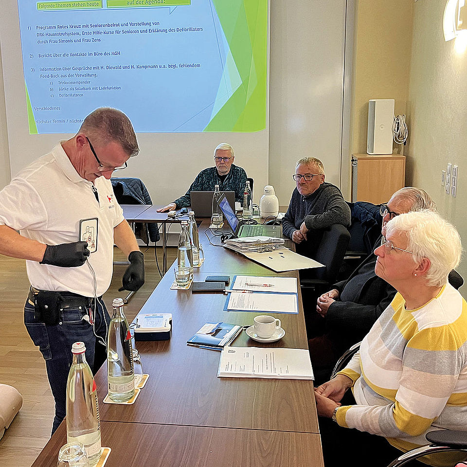 Auf ausdrücklichen Wunsch des Seniorenbeirats stellte DRK-Verwaltungsmitarbeiter Michael Kluge-Dummer die Handhabung von Laien-Defibrillatoren, sogenannten automatisierten externen Defibrillatoren (AEDs) vor. Insbesondere bei Kammerflimmern ist eine schnelle Defibrillation die einzige Chance zum Überleben und deshalb nahm sich der Rettungsassistent viel Zeit, zunächst die Funktionsweise des AEDs, die einzelnen Knöpfe und die Körperstellen, an denen die Elektroden angebracht werden, zu erklären. An einer lebensechten Puppe demonstrierte er die Anwendung eines AED sowie Herzdruckmassage und Beatmung.