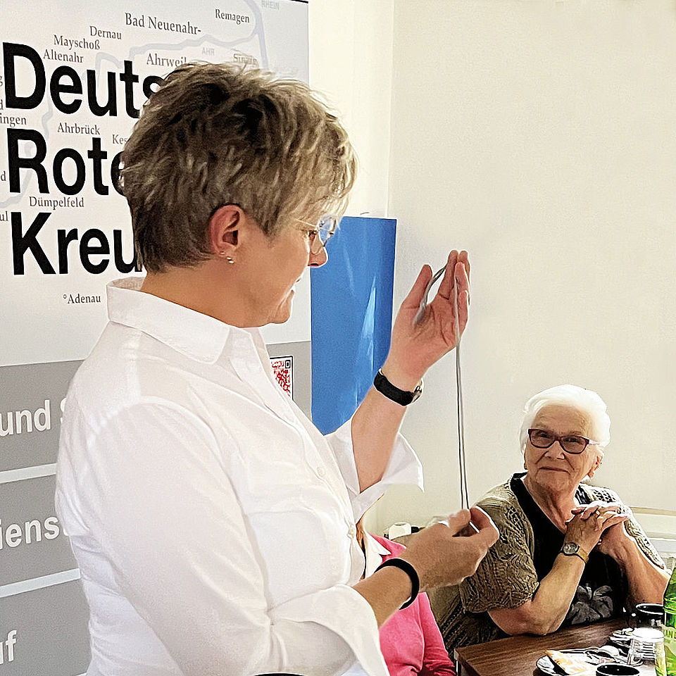Mit viel Herz, Charme und Witz erklärte Marion Simonis zunächst das Gerät, den Notfallknopf und die einfache Handhabung. Ausführlich schilderte sie die Abläufe nach Absetzen des Notrufs: Entsprechend des Hilfebedarfs disponiert das Fachpersonal der HausNotrufzentrale den Einsatz. Damit bei einem medizinischen Notfall schnell geholfen werden kann, ist der Rettungsdienst jederzeit in der Lage, auf die Schlüssel der Teilenehmenden zuzugreifen: „Und genau das macht den DRK-HausNotruf vom Ring bis zum Rhein, also im gesamten Kreis Ahrweiler, so besonders.“, sagte Marion Simonis. Nachdem sie über Kosten und Zuschüsse informiert hatte, stand sie bei der anschließenden Fragerunde geduldig Rede und Antwort.