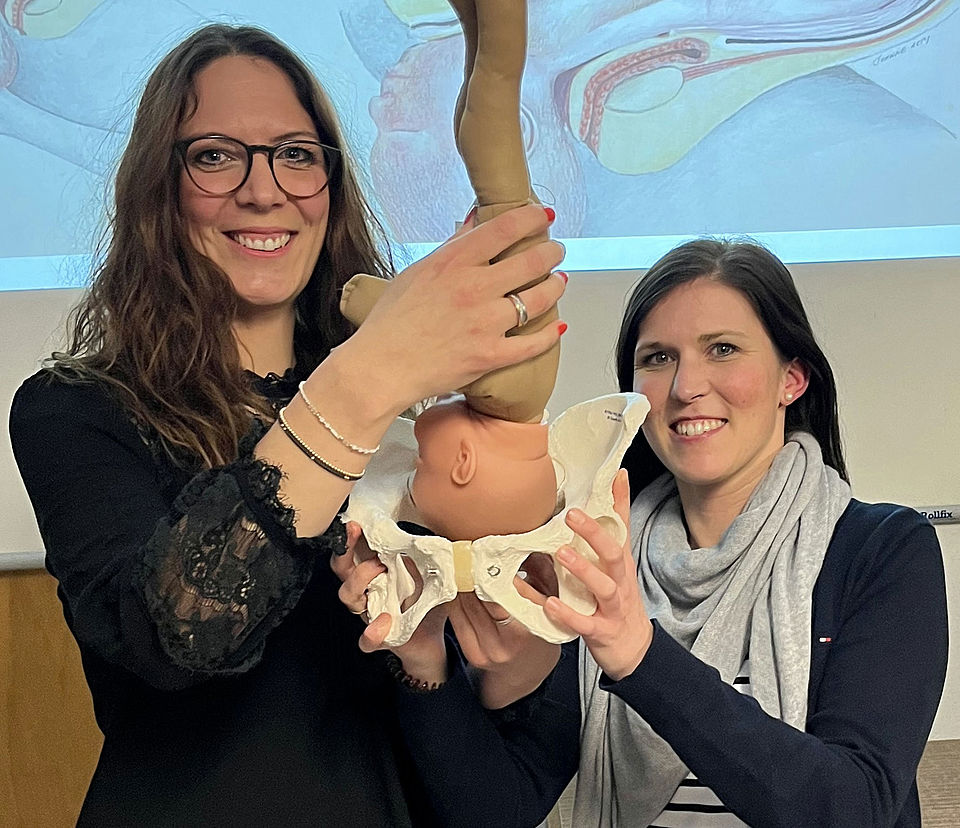 DRK_1_05.01.2023: Anhand eines Beckenmodells und einer Puppe erklärte Hebamme Carmen Eberle (li.) der ehrenamtlichen Rettungssanitäterin Ina Linden (re.) sowie den rund 40 Rettungsfachkräften die Austrittsphase bei einer Geburt.