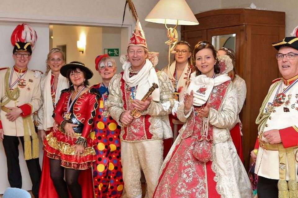 Die Rotkreuzmitarbeiterinnen Petra Schütz, Sabine Gremmler und die Freiwilligendienstleistende Anne Weltken hatten zusammen mit den Bewohnern das Buffet für den beliebten Karnevalsbrunch hergerichtet. Hausmeister Tim Atkins unterstützte die drei Rotkreuzlerinnen. Die amtierenden Tollitäten Prinz Bernhard I. und Prinzessin Anne II. (Jäger) marschierten mit Hofstaat und Gefolge um 10:15 Uhr für einen dreiviertelstündigen Besuch ins Weiße Ross ein. Der vom Spielmannszug wie immer in beeindruckender Weise musikalisch untermalte Aufmarsch der Narren brachte die Wände des Gemeinschaftsraums zum Beben und die Stimmung auf den Höhepunkt. Die DRK-Mitarbeiterinnen Petra Schütz und Sabine Gremmler wurden als Dank für ihre Arbeit zum Wohle der Senioren mit dem Sessionsorden geehrt. Schütz und Gremmler bedankten sich mit einem Geschenk an die närrischen Regenten für die hohe Auszeichnung.