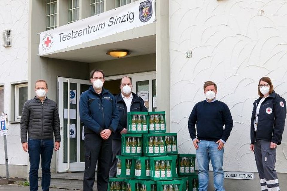 Bürgermeister Andreas Geron, Hausherr der Jahn-Sporthalle im Sinziger Dreifaltigkeitsweg 32, in der die Teststelle gemeinsam von DRK und Feuerwehr betrieben wird, bedankte sich für die Unterstützung. „Mit den nun steigenden Temperaturen können insbesondere die Helfer, die in der nicht atmungsaktiven Vollschutzkleidung die Abstriche bei den Testpersonen durchführen, die Erfrischung sehr gut gebrauchen“, freut sich DRK-Bereitschaftsleiterin Judith Grobelny für alle Helfer des Sinziger Schnelltestzentrums.