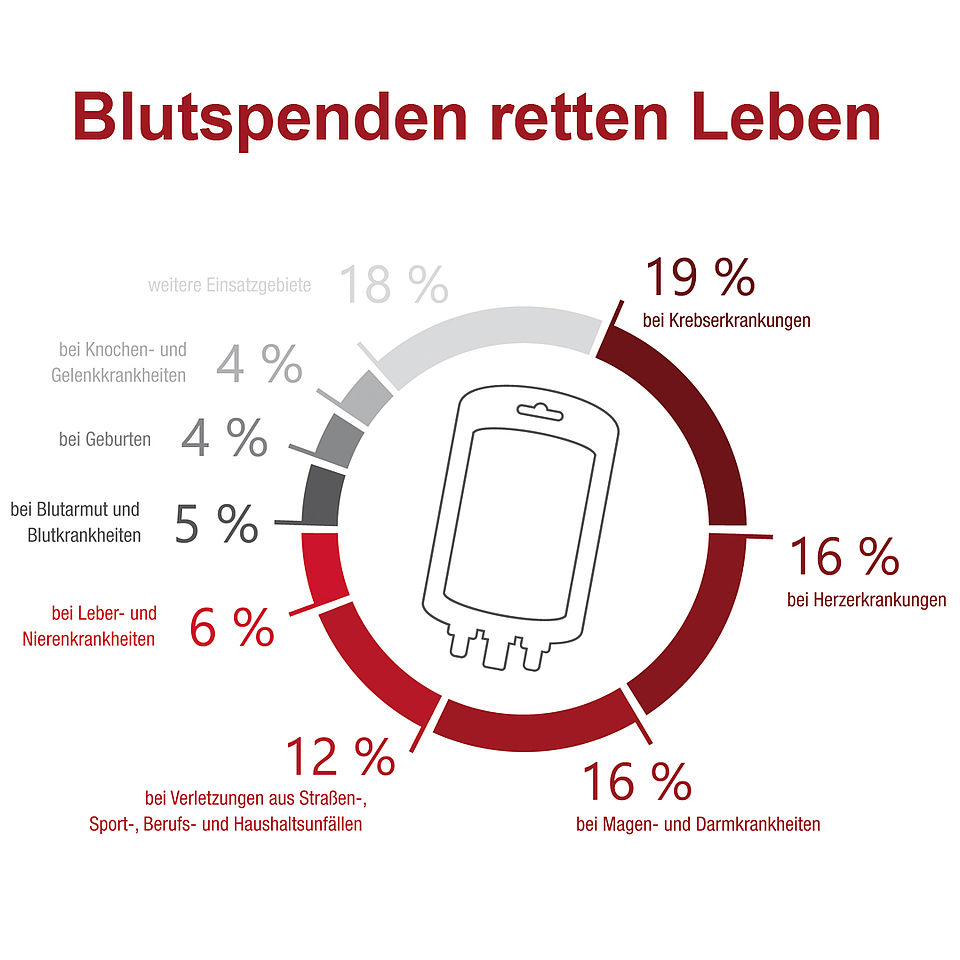 Derzeit spenden in Deutschland nur etwa drei bis vier Prozent der spendefähigen Bevölkerung, allerdings werden ca. 80 Prozent aller Deutschen einmal in ihrem Leben auf ein Blutprodukt angewiesen sein. Die eigentliche Blutspende dauert in etwa zehn Minuten. Mit den 500 ml abgenommenem Blut können bis zu drei Leben gerettet werden. Wer Blut spenden möchte, muss sich gesund fühlen, über 18 Jahre alt sein und mindestens 50 kg wiegen. Erstspender sollen höchstens 68 Jahre alt sein.