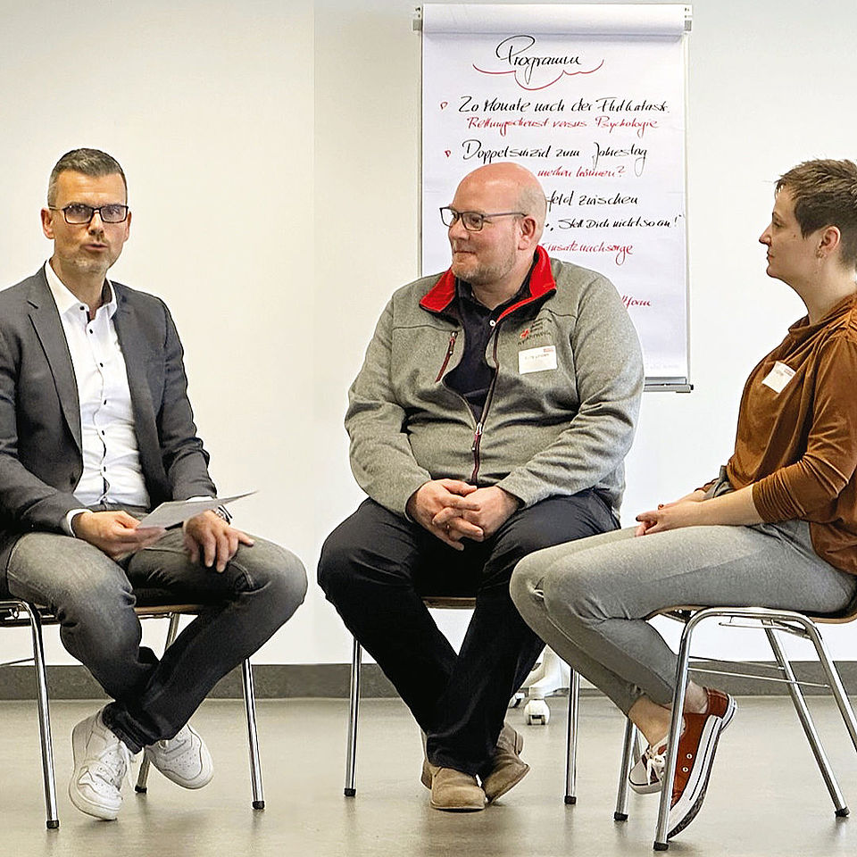 Nach der Flut standen die Mitglieder des PSNV-Netzwerks e.V. wenige Tage später bereit, an der Ahr mit ihren Gesprächsangeboten die haupt- und ehrenamtlichen Helfer zu entlasten. Um seinen Mitarbeitenden auch nach dem Fluteinsatz ein psychosoziales Unterstützungsangebot aufrecht zu erhalten, stellte der DRK-Kreisverband Ahrweiler e.V. im Oktober 2021 die Diplom-Psychologin Kim Bühler ein. „Kim Bühlers Angebot wird von unseren Haupt- und Ehrenamtlichen so gut angenommen, dass sie bei uns einfach nicht mehr wegzudenken ist. Es war uns deshalb ein großes Anliegen, dies beim Jahrestreffen des PSNV-Netzwerks e.V. genauer vorzustellen!“, sagt Ulrich Bergmann.