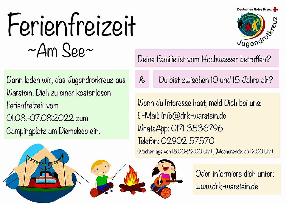 Die Flutkatastrophe im Ahrtal lässt nach der äußerst erfolgreichen Vorjahresaktion die Rotkreuzler in Warstein nicht los. Dank vieler Spender und Unterstützer des organisierenden DRK-Ortsvereins Warstein e.V. ist erneut eine kostenlose einwöchige Ferienfreizeit für Flutopferkinder möglich. Die Unterbringung während der Ferienfreizeit erfolgt auf einem Jugendzeltplatz am schönen Diemelsee.