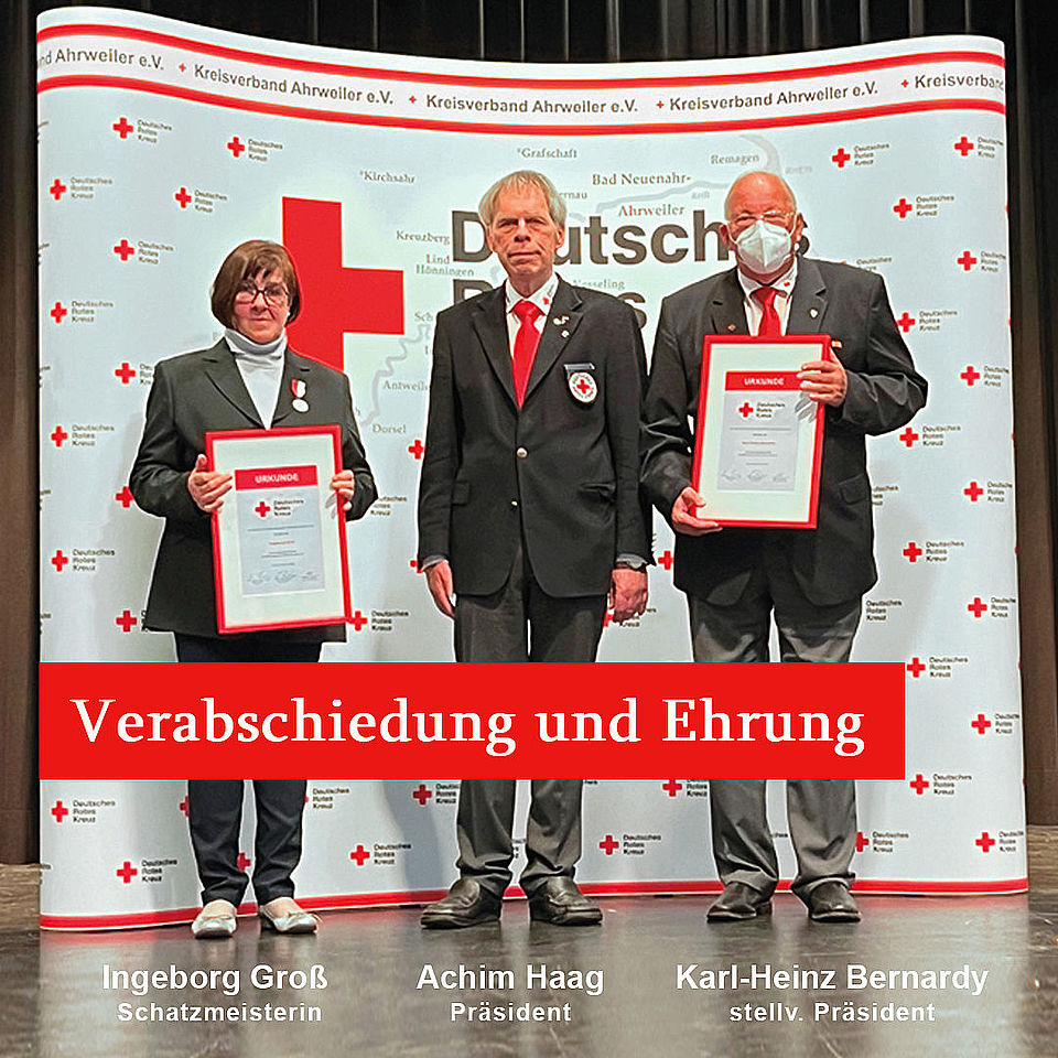 Die Präsidiumsmitglieder wurden einzeln mit großer Mehrheit oder gar einstimmigen Ergebnissen von den 106 stimmberechtigten Anwesenden gewählt. Die Wahlleitung übernahm Manuel Gonzalez. Kreisverbandspräsident Achim Haag wurde in seinem Amt bestätigt und wird die Geschicke des Kreisverbands auch in den nächsten fünf Jahren lenken. Thomas Hocke-Falcke bleibt einer der Stellvertreter. Achim Juchem wurde zum weiteren Stellvertreter des Präsidenten gewählt und folgt Karl-Heinz Bernardy. Michael Assenmacher ist neuer Schatzmeister und wurde Nachfolger von Ingeborg Groß. Kreisverbandsarzt Dr. Frank-Peter Kaesler und Justiziar Michael Spatz werden ihre Tätigkeit auch in den nächsten fünf Jahren weiterführen. Als Beisitzer wurden Andreas Müller, Hermann-Josef-Romes und Bernd Schricker gewählt. Kraft ihres Amtes werden die Leitungskräfte der Rotkreuzgemeinschaften (Bereitschaften, Jugendrotkreuz und Wasserwacht) das Präsidium des DRK-Kreisverbandes Ahrweiler e.V. vervollständigen.