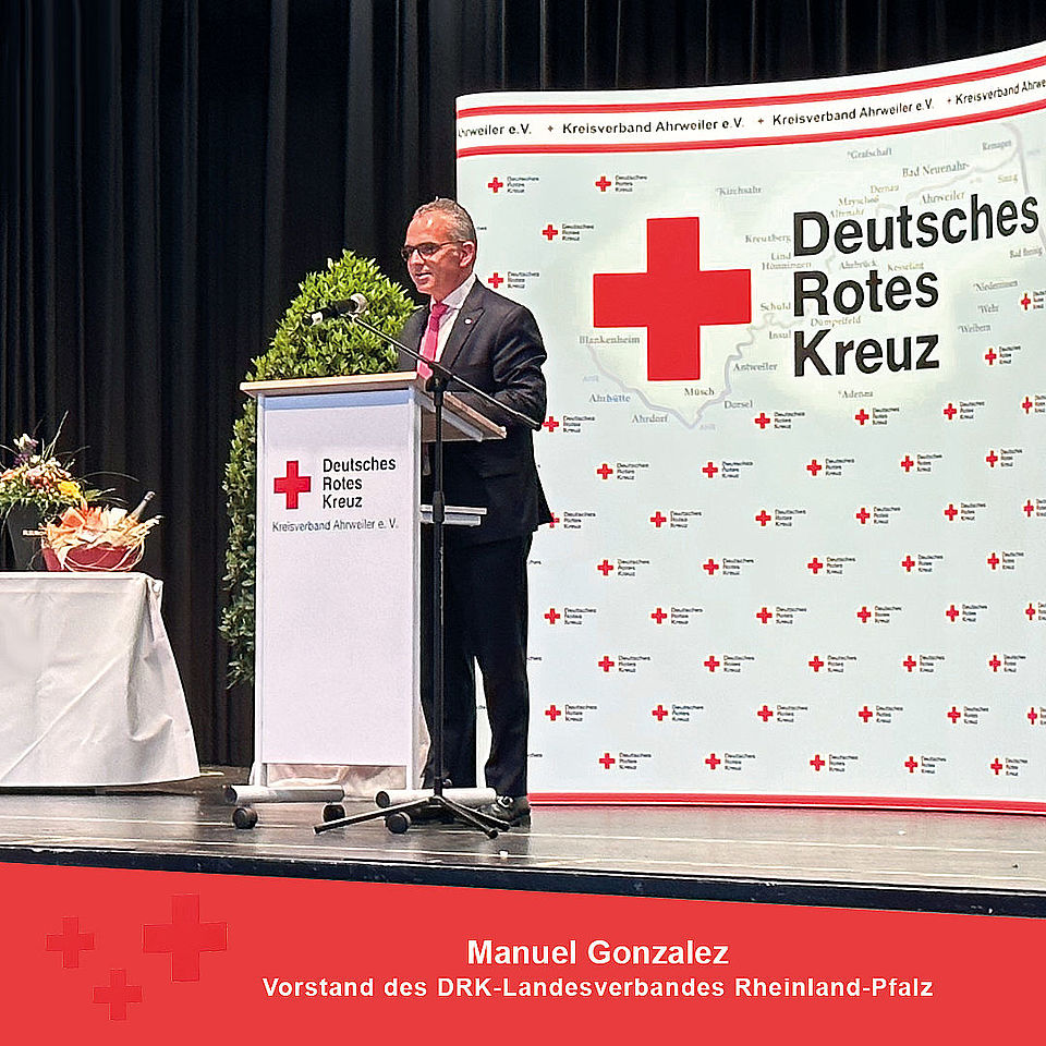 In seiner Grußbotschaft betonte Manuel Gonzalez, Vorstand des DRK-Landesverbandes Rheinland-Pfalz, die herausragenden Leistung der ehren- und hauptamtlichen DRK-Mitarbeitenden während der Pandemie und insbesondere der Flutkatastrophe. „Ich danke Ihnen, dass sie das Rote Kreuz nicht nur auf der Brust, sondern auch im Herzen tragen. Wir sind froh und dankbar, den Kreisverband Ahrweiler e.V. als starken Partner des Landesverbandes an unserer Seite zu haben.“, so Gonzalez.