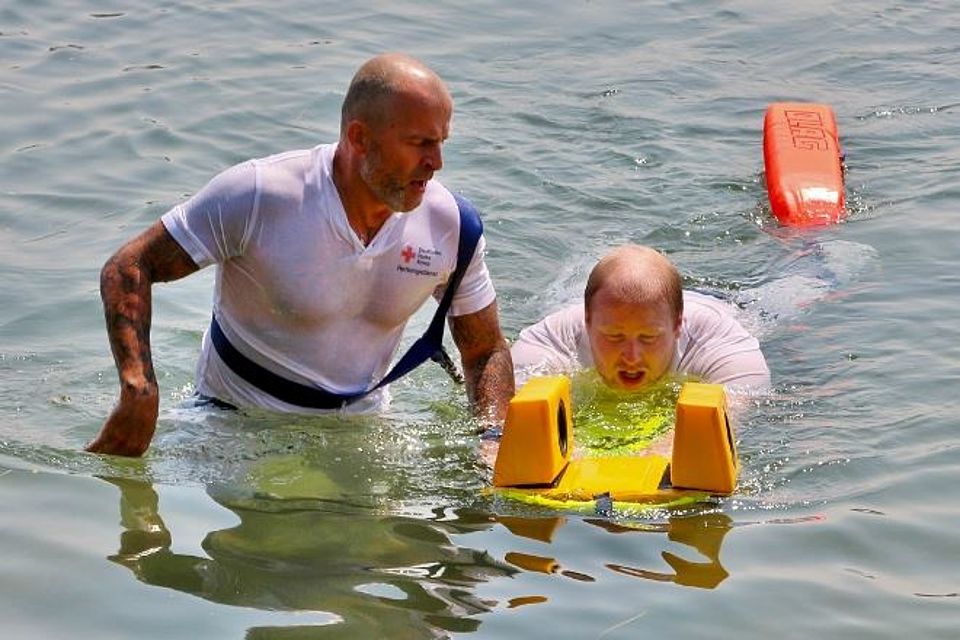 „Das an einem heißen Sommertag ein Praxistag zum Thema Wasserrettung besonders viel Spaß macht und die angehenden Rettungsfachkräfte intensiv insbesondere im Wasser geübt haben, versteht sich von selbst“, sagt DRK-Praxisanleiterin Lisa Briese. Zusammen mit ihren Kollegen Florian Weidenbach und Carsten Waldorf hat Briese den Praxistag begleitet. Trotz bereits vieler Jahre ausreichender Berufserfahrung im Rettungsdienst haben auch die Praxisanleiter einiges hinzugelernt. So war es für die Rettungsprofis interessant zu sehen, wie ein spezielles schwimmfähiges Rettungshilfsmittel, das sogenannte Spine Board, sich im Wasser verhält und wie man damit Personen auf ein Rettungsboot oder an Land bringen kann.