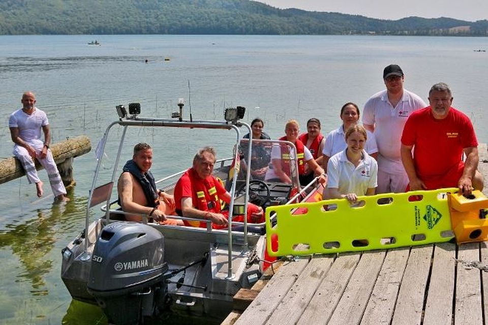 Darüber hinaus standen die Vorstellung und Handhabung spezieller Wasserrettungsmittel, wie etwa der anfangs genannte flexible Schaumstoffkörper, ein sogenanntes Rescue Tube, auf dem Ausbildungsprogramm. Die Einsatzmöglichkeiten eines Wasserrettungsbootes demonstrierte Bootsführer Achim Haag den DRK-Auszubildenden während einer Rundfahrt über den Laacher See. „Wir wollen gar nicht in einem Tag aus einem Landretter einen Wasserretter machen. Der Ansatz, den Fachdienst Wasserrettung genau vorgestellt zu bekommen und einige einfache Maßnahmen zu lernen, ist für die angehenden Rettungsfachkräfte gut. Letztlich kann und muss jeder Retter situativ für sich entscheiden, wie er sich in seltenen und speziellen Notfallsituationen verhält, welche weiteren Schritte er veranlasst und welche individuellen Maßnahmen unter Berücksichtigung des Eigenschutzes er durchführt“, zieht DLRG-Wasserretter Michael Seimitz sein persönlich Fazit des Praxistages für die Rotkreuzler. Spaß hatten definitiv alle an diesem ungewöhnlichen und gleichzeitig erfrischenden Unterrichtstag am und im Laacher See.