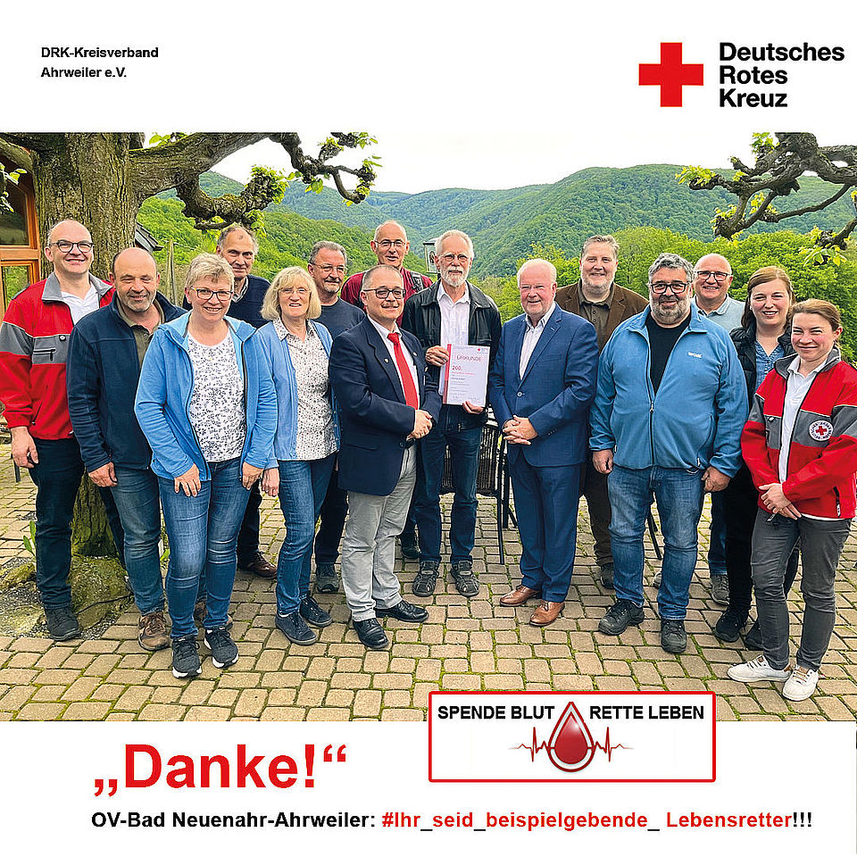 DRK_17.05.2023: Ehre wem Ehre gebührt: Harmen Eckert (9. v. li.) hat bereits 200 Mal Blut gespendet und wurde dafür von Michael Assenmacher (7. v. li.), Vorsitzender des DRK-Ortsvereins Bad Neuenahr-Ahrweiler, geehrt. (Foto: Philipp Münch)