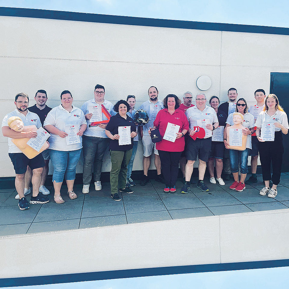 DRK_16.06.2023: Das Lernen hat sich für die 14- ehren- und hauptamtlichen DRKler gelohnt: sie sind haben die Prüfung zum Ausbilder bzw. zur Ausbilderin Erste Hilfe bestanden und dürfen nach der Praxisphase eigenständig Erste-Hilfe-Kurse sowie Aus- und Fortbildungen für Betriebshelfer geben. (Foto: Michael Alberti /DRK-Kreisverband Ahrweiler e.V.)