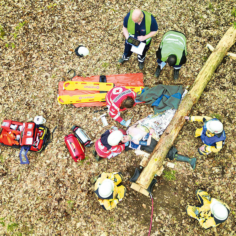 DRK_18.07.2023: Bei einer Großübung mit der Feuerwehr übten die DRK-Azubis im Rahmen eines Praxistages die Versorgung und das Retten von Personen mit Verbrennungen im Wald. (Foto: Denis Freund / DRK-Kreisverband Ahrweiler e.V.)