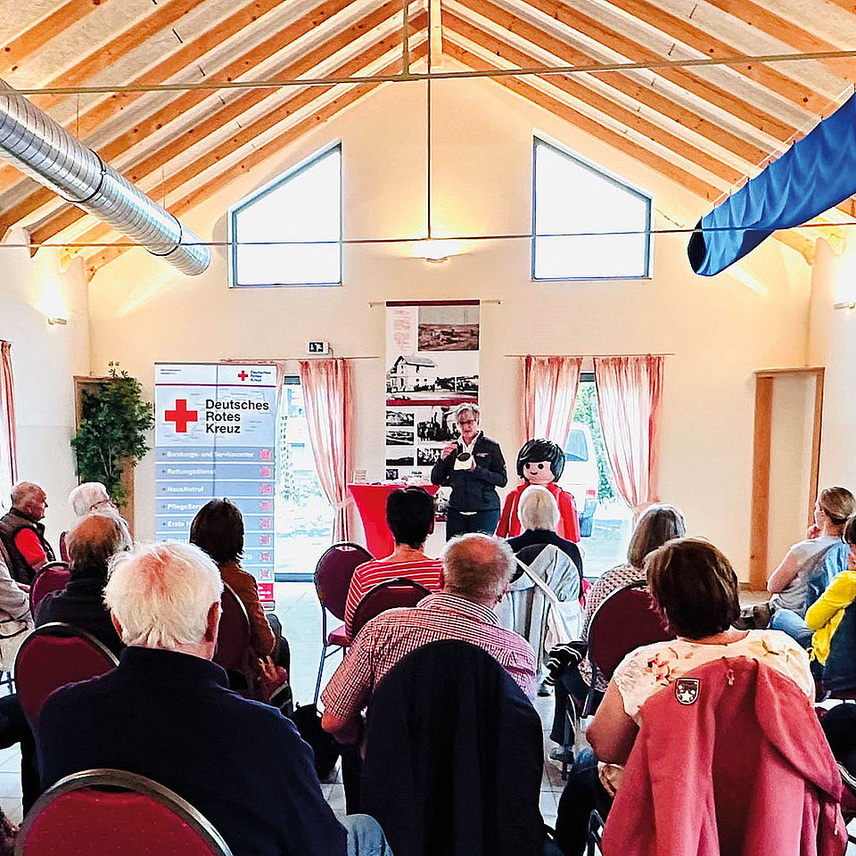 Rund 25 Mitglieder der Herzsportgruppe sind kürzlich in das Kempenicher Bahnhofshäuschen gekommen, um sich über den HausNotruf zu informieren. Dieser bietet Sicherheit in vertrauter Umgebung und erlaubt gesundheitlich eingeschränkten, behinderten oder betagten Personen, weiterhin zuhause zu leben. Mit viel Herz erklärte Marion Simonis die einfache Handhabung, das Gerät und den Notfallknopf. Sobald dieser gedrückt wird, baut sich der Kontakt zur HausNotrufzentrale auf. Dort disponiert das Fachpersonal entsprechend des Hilfebedarfs den Einsatz. Die anschließende Hilfeleistung erfolgt über den DRK-Kreisverband Ahrweiler e.V. „Und für diesen Fall gibt es eine im Kreis einzigartige Besonderheit: Um im Notfall schnell reagieren zu können, kann der Rettungsdienst jederzeit auf die Schlüssel der Teilnehmenden zugreifen.“, berichtete Marion Simonis.