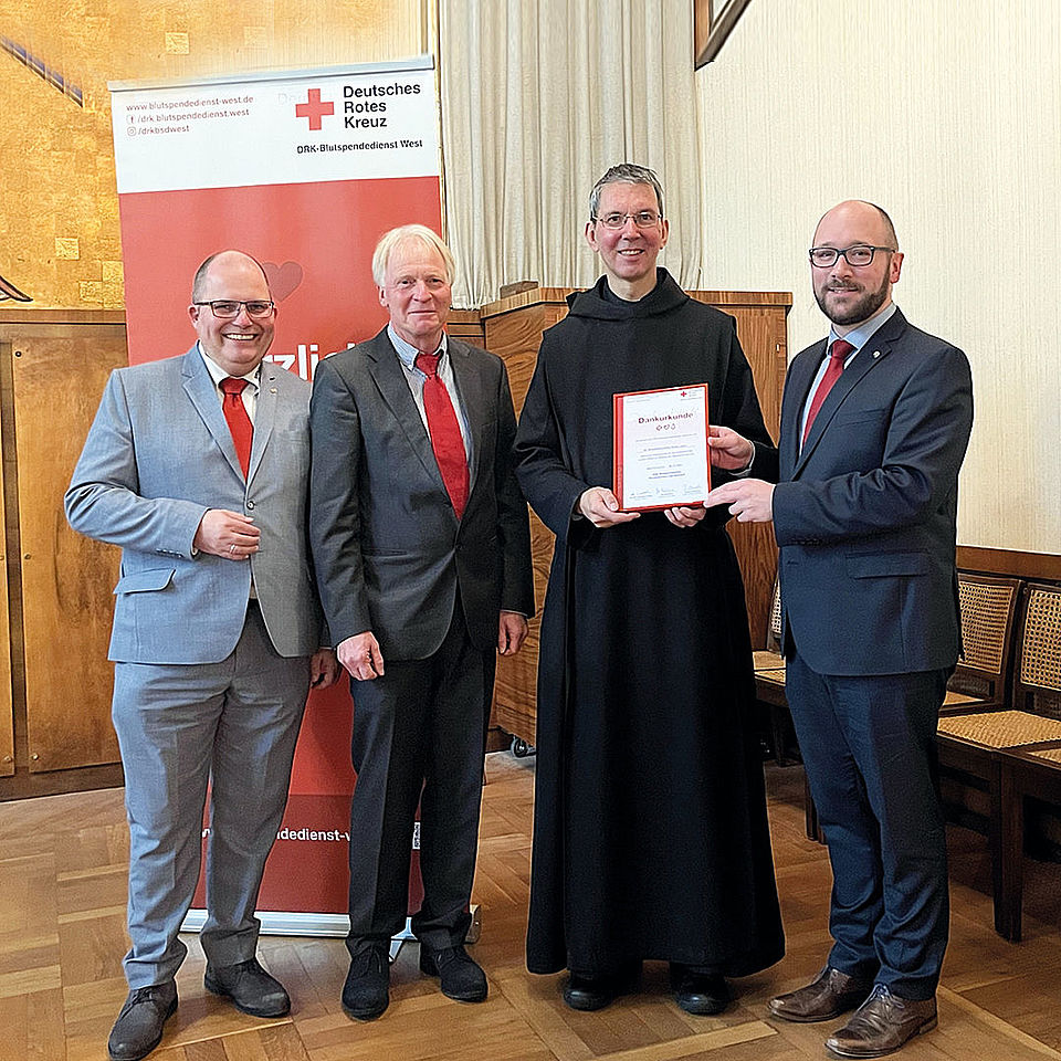 Höhepunkt des Festaktes war die Überreichung einer Ehrenurkunde an Pater Prior-Administrator Petrus Nowack OSB als Vertreter der Abtei. Überreicht wurde die Urkunde von Jörg Backhaus (Kaufmännischer Leiter DRK-Blutspendedienst Rheinland-Pfalz und Saarland), Benjamin Albrecht (Leiter Spendeorganisation DRK-Blutspendedienst Rheinland-Pfalz und Saarland), und Franz-Josef Schneider (Gebietsreferent). Ein Orgelkonzert mit Pater Philipp Meyer OSB in der Abteikirche bildete einen stimmungsvollen Auftakt, gefolgt von Ansprachen von Pater Prior-Administrator Petrus Nowack OSB, Benjamin Albrecht, Jörg Backhaus und Friedhelm Münch (Beigeordneter des Landkreises Ahrweiler), die alle auch auf die Lebensnotwendigkeit von Blutspenden hinwiesen.