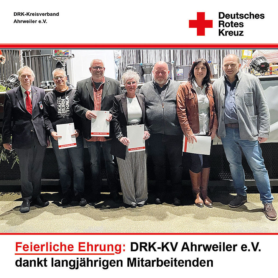 DRK_12.12.2023: DRK-Kreisverband Ahrweiler e.V. ehrt die Jubilare Birgit Müller (2. V. re), Alexander Bick (3. V. re.), Armin Link (3. v. li.), Marianne Flohr (4. v. li.) und Mike Kairies (2. v. li.). (Foto: Astrid Zens / DRK-Kreisverband Ahrweiler e.V.)