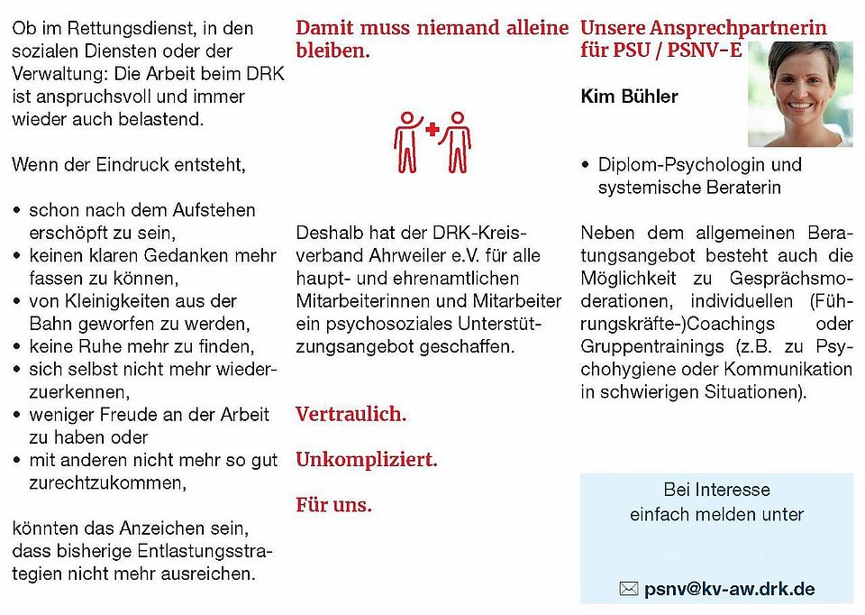 Die Psychosoziale Untertsützung (PSU) und die Psychosoziale Notfallversorgung für Einsatzkräfte (PSNV-E) zielen auf die Bewältigung von besonderen Lebensereignissen und den damit einhergehenden Belastungen ab, wie sie unsere Mitarbeiter während ihrer täglichen Dienstausübung erleben können.